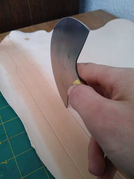 Cuando usted está satisfecho con la marca hacia fuera, cortar el cuero con un cuchillo - no es una carrera, tenga cuidado y no hay necesidad de cortar a través de la piel en la primera pasada. Usted puede hacer varias pasadas para cortar a través de la piel - esto es a menudo necesaria si usando el cuero más grueso y más fácil de administrar.