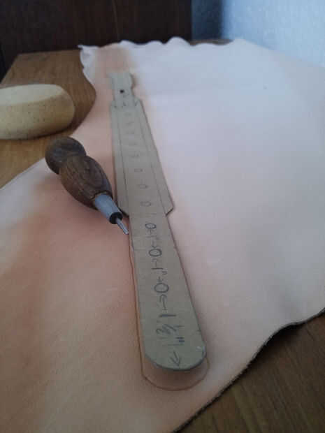 Humedecer el cuero con una esponja (ligeramente) y coloque la plantilla sobre una suficiente longitud de cuero para poder cortar a ambos lados del cuello en una sola pieza y luego marque el perimiter de la guía de corte con una lezna del rasguño (alternativamente, en el lado de la carne de la marca cuero perimiter utilizando un lápiz como no será visible cuando cosen)