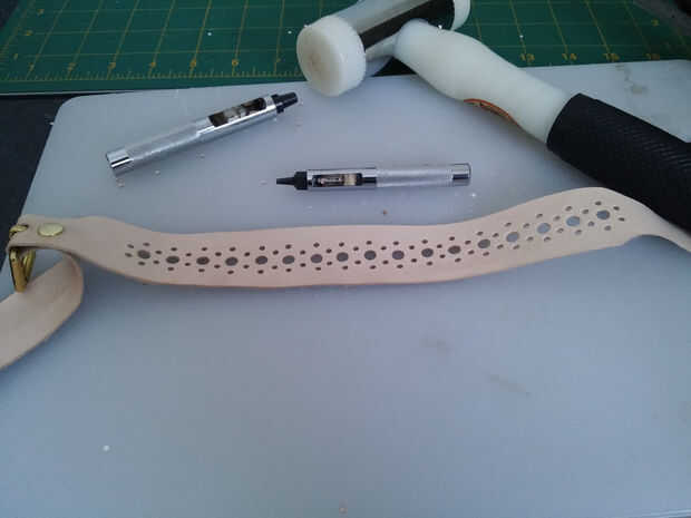 En la parte del cuello donde la luz tubo será, ir a la ciudad con las perforaciones y subir con cualquier patrón quieres lucir ese lujo LED luz en su collar. Elegir simple tener grandes agujeros cada pulgada con 6 agujeros más pequeños circundantes - algo en forma de flor para mi LED chica rosa