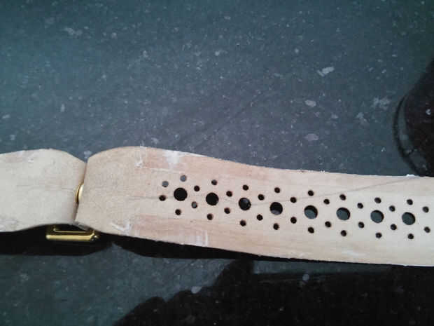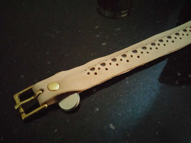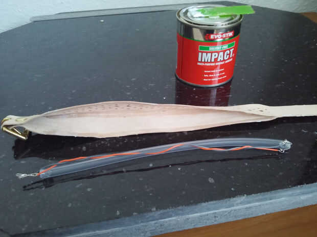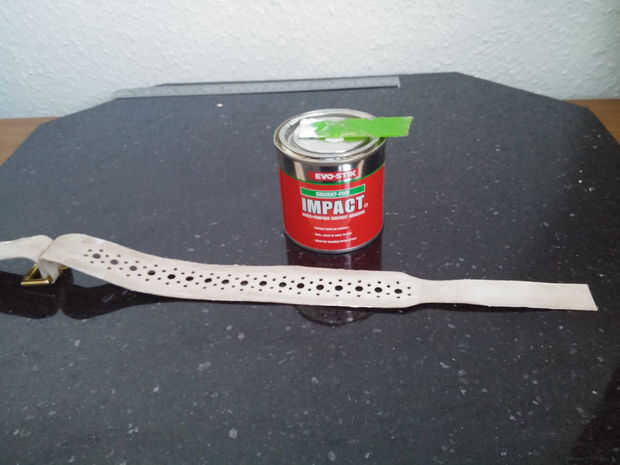 Aplica el pegamento de contacto a 1/4" de la perimiter del cuello (dejando lo suficiente para ser capaces de insertar y quitar la batería en el extremo de la hebilla), permitió al conjunto y a partir de entonces con el borde superior alinear las dos mitades y presionados juntos, luego con la parte inferior la mitad abierta introduce la luz de tubo y finalmente presiona juntos el resto.
