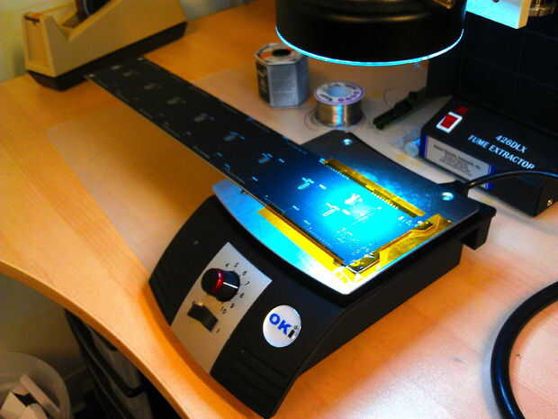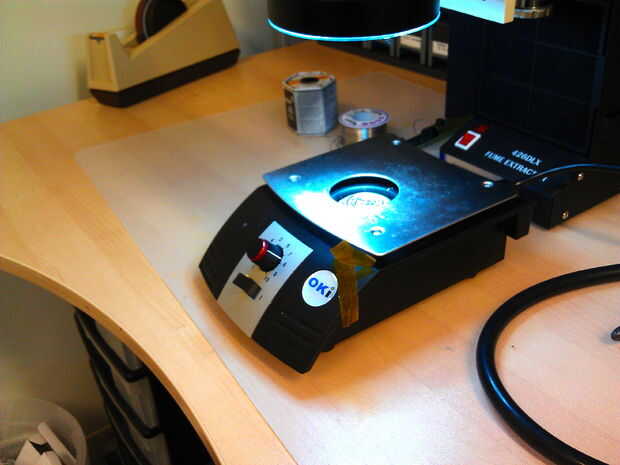 Para empezar, seguro la placa bajo el alcance con alguna cinta de kapton, encender el precalentador si usted tiene uno y tomar alguna soldadura.