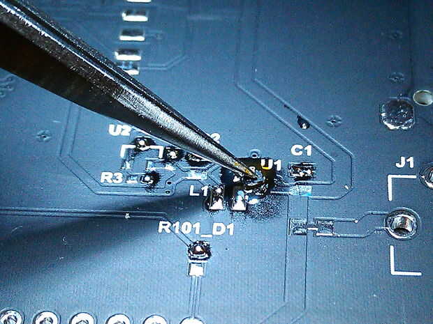 Para flujo de aire caliente soldar (usado para la soldadura de abajo el sensor TPS62237 y Taos), prepare la zona con un flujo y, a continuación, poner una pequeña gota de soldadura en cada cojín. Coloque el componente hacia abajo en la parte superior del flujo, teniendo cuidado de alinear el indicador del pin 1 (generalmente un punto blanco o hierba) con el indicador del pin 1 en la serigrafía (un punto blanco). Mantener la pieza en su lugar suavemente con la punta de las pinzas, luego calor directamente por encima con la pistola de calor hasta que la soldadura fluya. Desalineamiento leve antes de poner en la pistola de calor es aceptable - la tensión superficial de la soldadura será tirar de la parte en posición cuando la soldadura comienza a fluir. Una vez que la soldadura fluya y se alinea la parte, tirar de las pinzas lejos primero, luego con la pistola de calor.