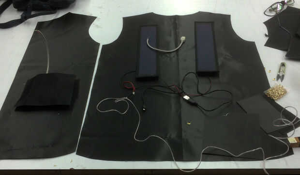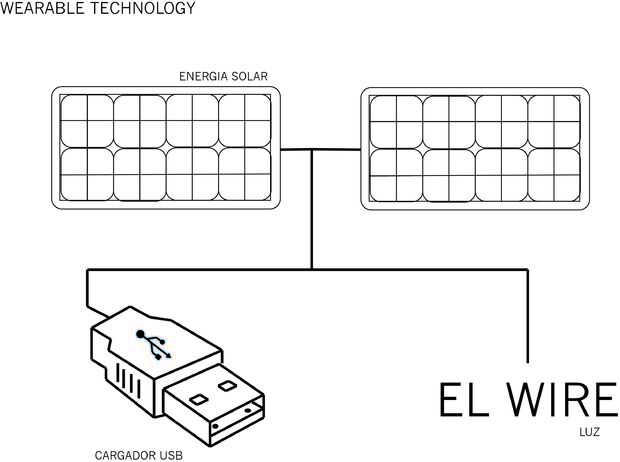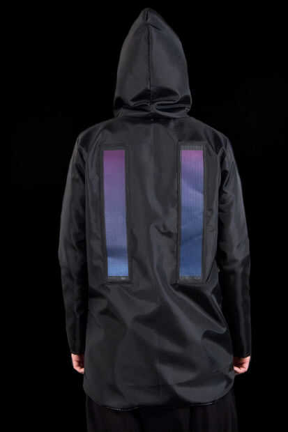 Esta chamarra tiene dos paneles solares cargan tu celular, así como un detalle de iluminación con tecnología EL cable ilumina la parte inferior de la chamarra. Esto para ser visto de noche.