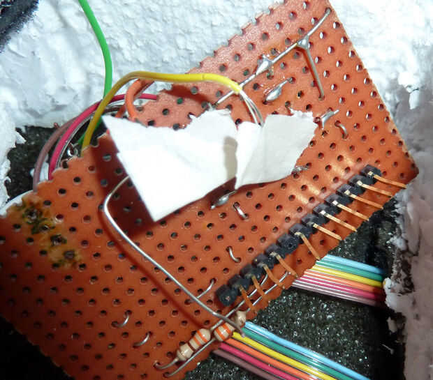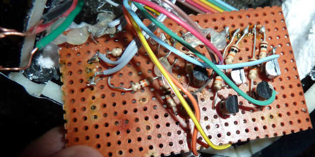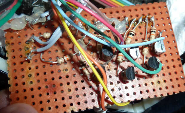 Ahora, utilizamos una placa de experimentación (un tablero del silicio con un montón de agujeros en ella) para mantener todas nuestras resistencias y transistores en el lugar en la parte posterior del casco. El que nuestro profesor nos dio ya tenía un montón de cosas, por lo que sólo cortarlo todo, excepto algunos pins aspecto agradables que encajarían muy bien en el Arduino. Lo único que era un dolor era que todos en el grupo eran bastante nuevo a soldar (que explica los cables despojado de largo). Las clavijas ya tenían de soldadura en la parte posterior de ellos de su uso anterior, y probaron ser difíciles de eliminar. Tan sólo salió de allí y poner nuevos de soldadura en la parte superior. NO HACER ESTO. Se reúne en grupos masivos y puede ser aún más difícil de eliminar luego. Algunos de los soldadores fue difícil y consiguió en otros pines (que es por pin 7 no fue utilizado en nuestro código Arduino). También, cuando se presiona el perno en los transistores hacia atrás a través de la placa experimental, yo accidentalmente estafado les así el cable tuve que soldar en la parte posterior. Pero bastante QQ por ahora, hacia el proyecto.