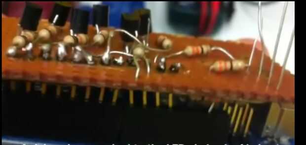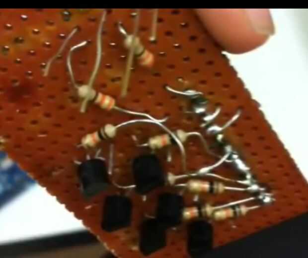 Nos dimos cuenta de algo temprano por; el Arduino solo tiene 3 pines de tierra. Para solucionar esto, usamos transistores conectados a algunas de las salidas digitales del Arduino, por lo que cuando la salida se establece en alta, el transistor lo cambiaría en un suelo. Al principio decidimos hacer los motivos de filas por lo que sólo tendríamos que utilizar 4 transistores, pero una falta de comunicación (piernas cortas y largas de los LEDs) llevan utilizando las columnas como con 6 transistores. Esto condujo a más desordenado tablero experimental, pero supongo que fue culpa nuestra.