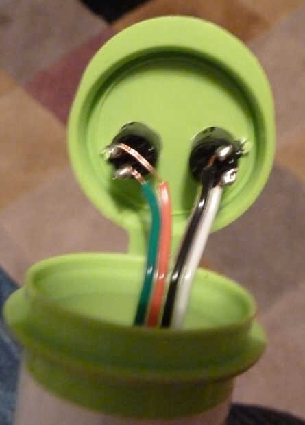 Encontré una antigua botella M & Ms mini que planeaba sobre replanificación en una linterna, pero nunca llegué a lo (historia de mi vida), acabado así que decidí usarlo como una cubierta para mantener los botones en su lugar. Además, encaja bien en la mano. Hemos perforado los agujeros en la tapa para que los botones podrían caber cómodamente dentro de ellos. A continuación, corte la parte inferior y funcionó algún alambre de la cinta hasta los botones, soldar en su lugar. Podría cinta el alambre en el interior de la botella, pero no por lo que aún podemos abrir la tapa para comprobar la soldadura en los botones. Luego basta con ejecutar el cable a través del agujero en la tela con el agujero de Arduino. Los botones deben enchufarse analógicos 1 y 2 análogo a la tierra (si usted quiere usar nuestro código).