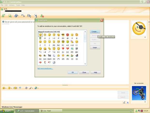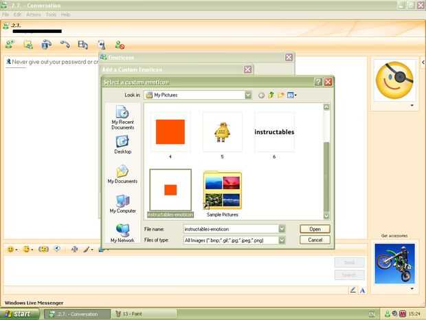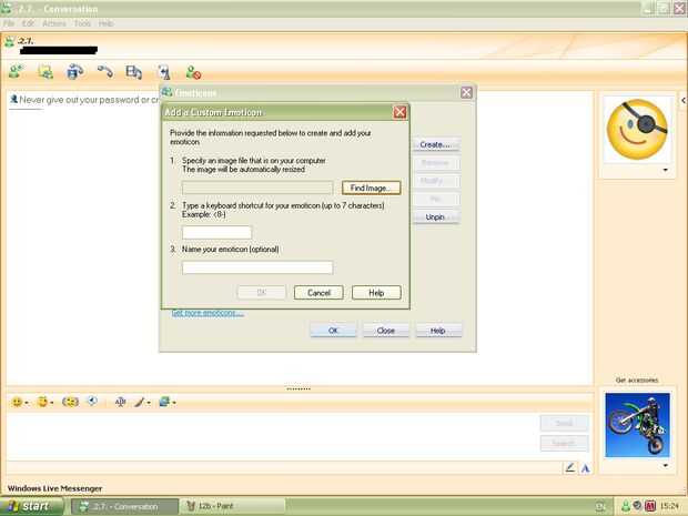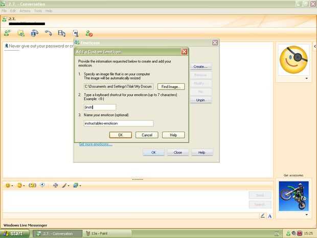 Cuando en conversación con alguien, haga clic en el menú de emoticonos y luego mostrar todo. Haga clic en crear en el menú emergente y habrá otro pop-up. Haga clic en buscar imagen y seleccione la imagen/animación que desee utilizar. Dar un atajo de teclado. y (si quieres) un nombre. Haga clic en Aceptar. Entonces debería aparecer en emoticonos personalizados. Hice la primera de ellas y pidió prestado el próximo 2 de un amigo.