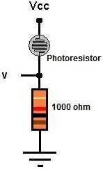 El circuito para el fotoresistor se muestra en la figura siguiente, donde está vinculado a la alimentación (Vcc) y otra de resistencia, una resistencia de 1Kohm