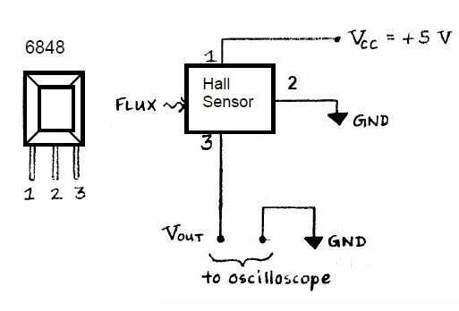 El circuito del sensor de efecto hall se muestra en la figura 2 a continuación. No se olvide de mirar la orientación de su sensor de efecto hall para