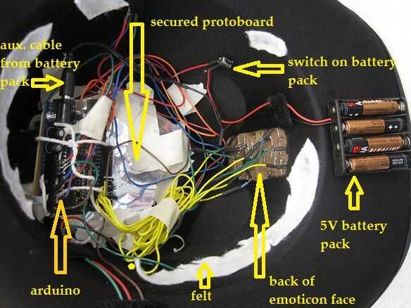 se ve el sombrero. Más tarde todo ello está cubierto por un pedazo grande de fieltro para ocultar estos electrónica y hacer experiencia del sombrero portador
