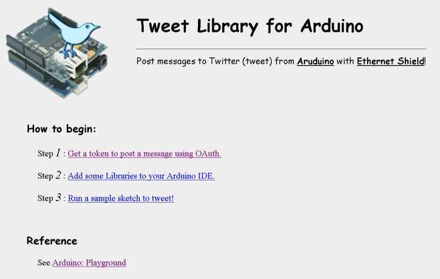 Para comenzar a trabajar, necesita en tu información de cuenta de Twitter en el sitio según las instrucciones y a cambio obtener una autenticación token el sitio. Incrustar este token en el sketch de Arduino, utilizando la constante TWITTER_OAUTH_TOKEN y carga el bosquejo modificado en el Arduino.