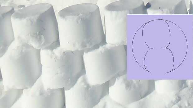 Rastrear con el arranque o con un palo un gran círculo en la nieve para establecer el patrón que seguirá para poner hacia fuera el primer nivel de las paredes de la empalizada, interiores y exteriores. Después de haber trazado el primer nivel, asegúrese de alternar los bloques (alternando como las capas de ladrillos en una pared de ladrillos) en el segundo nivel y en cada nivel posterior. Arriba es una foto de los bloques escalonados de la melcocha.