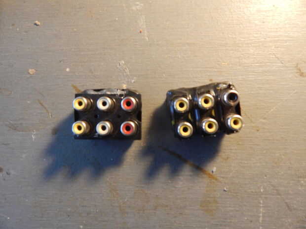 En la práctica tipo RCA cables se utilizan a menudo en pares (ej.: audio estéreo) o incluso tríos (ej.: 3 color video). Para estos usos simplemente utilice conectores con más conexiones y conéctelos encima como si fueran tres simples juegos de gatos como en el paso anterior. Final de la misma manera. Acopladores doble terminados con conectores con 2 sets de 2 gatos.
