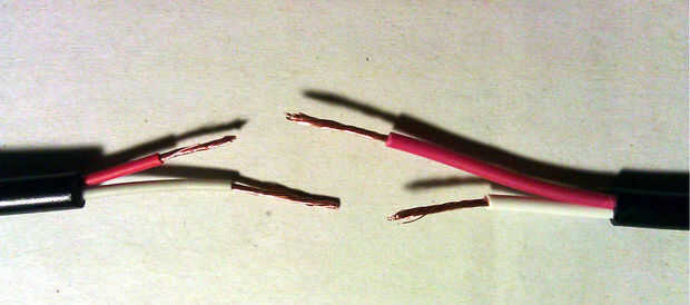 Vamos a empezar. Estoy utilizando un cable de alimentación del ordenador portátil como un ejemplo. Si los cables que son empalme tienen una chaqueta, suavemente de la tira cerca de 1 1/2 pulgadas de la chaqueta en cada extremo del cable, teniendo cuidado de no nick el aislamiento interior. Aquí los cables están codificados por colores, por lo que te unirá a blanco con blanco y rojo con rojo. En el extremo de un cable, corte de interior cables aproximadamente 1/2" de más corto que el otro. Tira de 1/2" de ambos cables. (Estas dimensiones variará dependiendo del grosor de los cables que te unirá a. 1/2"- 5/8" funciona bien para pequeño calibre cables.)