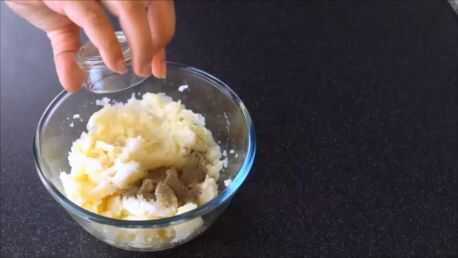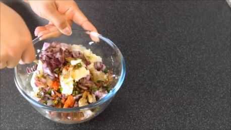 En el tazón de puré de patatas, poner sal, pimienta negra en polvo, polvo de coriandro, comino, pimentón, chiles verdes y cebollas. Mezclar muy bien. Puede utilizar las manos para mezclar todo correctamente.