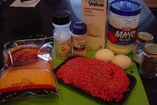 Dorar las hamburguesas con aproximadamente la mitad de la mezcla de sopa de cebolla o condimento mezcla abajo *** no agrego ningún condimento para hamburguesa cocina *; escurrir la grasa y sazone al gusto con sal y pimienta. Agregue el resto de mezcla de sopa o mezcla de condimentos y poner la carne en una tartera engrasada pulgadas 9-10. Revuelva en la mitad del queso, luego cubra con el queso restante. Batir los huevos, mayonesa, crema y una pizca de pimienta. vierte uniformemente sobre la carne. Hornee a 350 º durante 30-35 minutos. *** Asar a la parrilla durante unos 3 minutos a brown hasta la parte superior Deje reposar 10 minutos antes de servir.