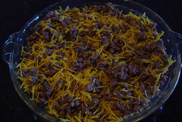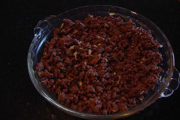 Poner la hamburguesa dorada, drenada en un molde de tarta de 9 o 10 pulgadas.