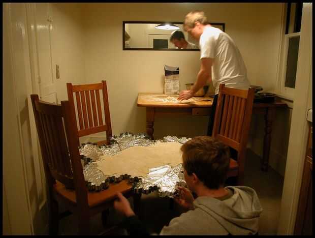 papel de aluminio forrado el molde y que nos protegió de la construcción no-tan-inofensivo para la salud. corteza era una receta tradicional. Corte la mantequilla fría en la harina y añadir un poco de hielo de agua según sea necesario para hacer la pasta. mínimo de amasado necesaria. los bolsillos pequeños de mantequilla derretirán y hervir durante el proceso de cocción dando el flakyness codiciado de una buena tarta
