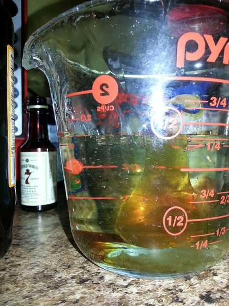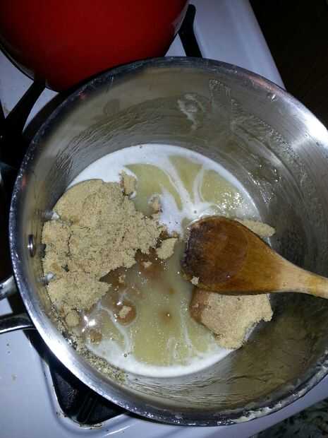 Agregar en la taza llena de azúcar morena, luego el jarabe de maíz / piedra de afilar, y luego la melaza y la vainilla. Revuelva hasta que el azúcar se disuelva. Mientras esto se está calentando, prepárate tus huevos.