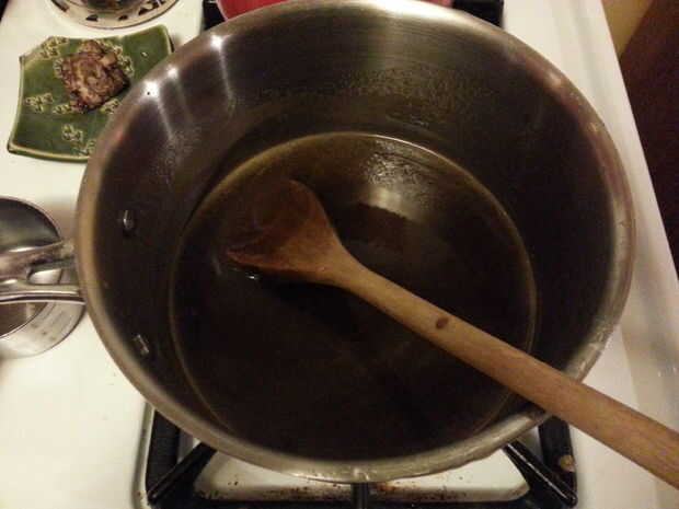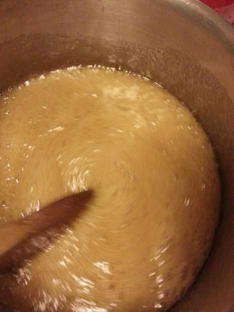 Llevar la mezcla de almíbar a ebullición, revolviendo regularmente. Déjelo hervir durante un rato. (tal vez un minuto?)