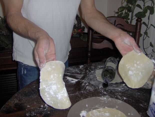 dividir la masa en pequeñas bolas de unos 15-20 y cada rollo hasta plana y delgada. añadir harina Si llegan a ser demasiado pegajosas.