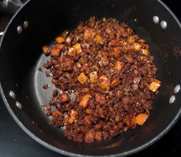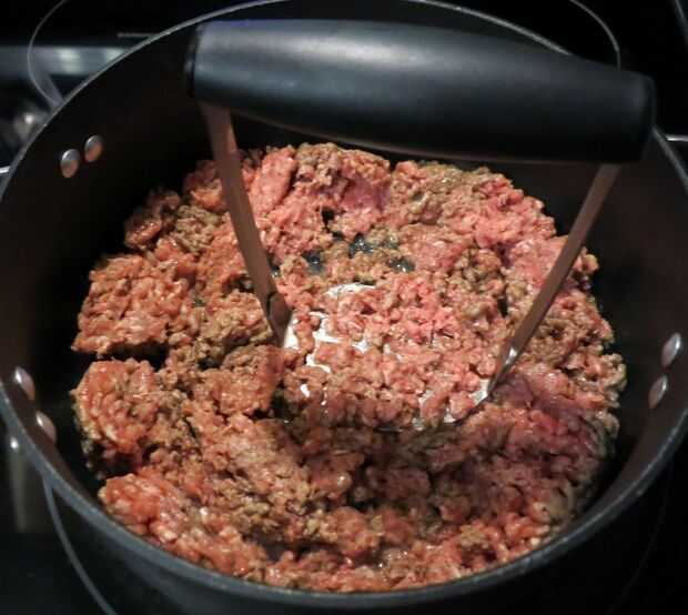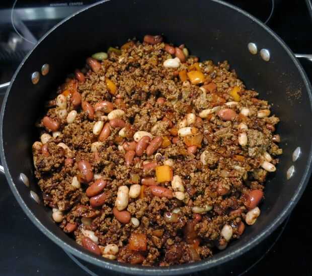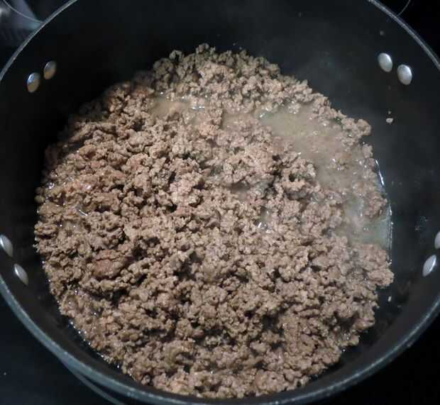 Subir el fuego a medio-alto y añadir la mitad de la carne; Cook, rompiendo piezas con cuchara de madera, hasta que ya no rosa y empezando a dorarse, 3 a 4 minutos. Añadir carne y cook, rompiendo piezas con cuchara de madera, hasta que ya no rosas, 3 a 4 minutos restantes. (No me gusta la carne grasienta, así que siempre me cocinar primero la carne en la olla, escurrir en un colador, limpie el exceso de grasa de la cacerola, luego agregar el aceite y empezar a cocinar las cebollas y pimientos. Añadir la carne de vacuno a la cacerola en el paso siguiente.)