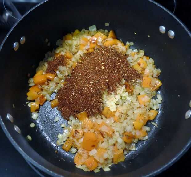 Caliente el aceite en gran fondo pesado no reactivo olla sobre fuego medio hasta brillantes pero no fumar, 3 a 4 minutos. Añadir cebolla, pimiento, ajo, Chile en polvo, comino, cilantro, pimienta escamas, orégano y pimienta; Cocine, revolviendo ocasionalmente, hasta que las verduras están blandas y empezando a dorar, unos 10 minutos (generalmente doy las cebollas y pimienta un headstart en tueste antes de añadir las especias).