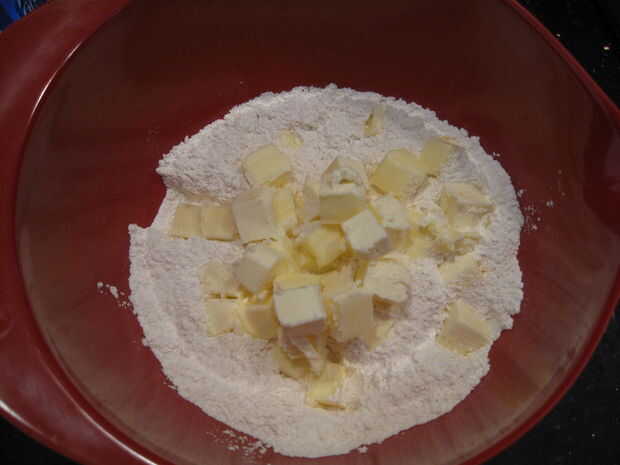 2. Añadir la mantequilla y batir a velocidad media-baja hasta que la mezcla se parece a comida grueso - aproximadamente 1 1/2 a 2 minutos