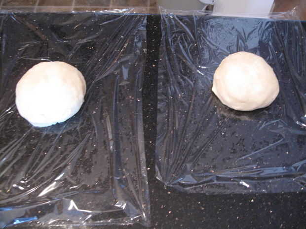 4. dividir la masa por la mitad. Forma cada mitad en una bola y envolver con plástico para envolver. Refrigere por al menos 2 horas para arriba hasta toda la noche.