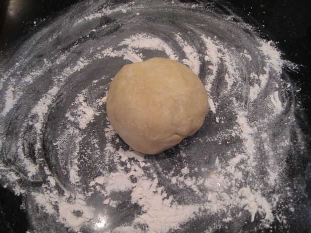 7. sobre una superficie enharinada, estirar una de las bolas de masa hasta 1/8 de pulgada de espesor.