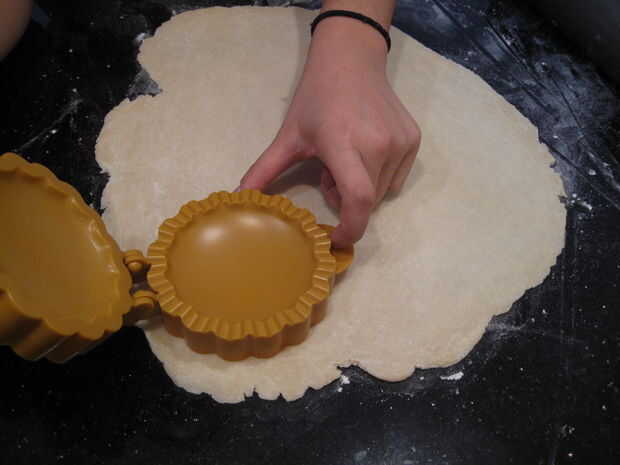 8. Use un molde de pastel de bolsillo, cortar las formas sólidas. Repita con la otra bola de masa. Tirada la masa sobrante, si es necesario y cortar formas más sólidas.