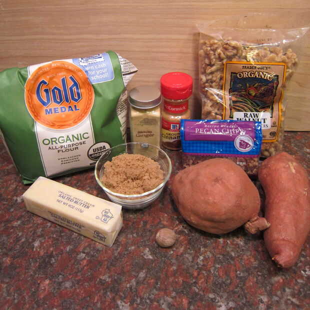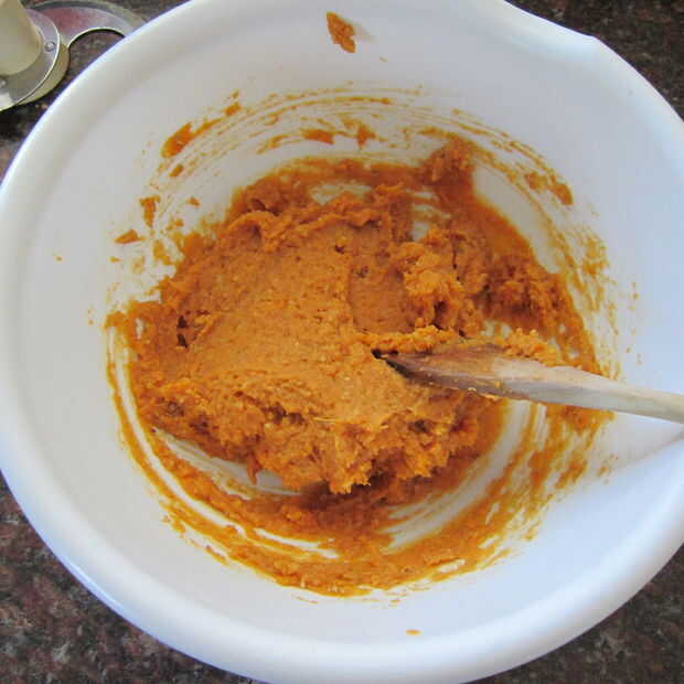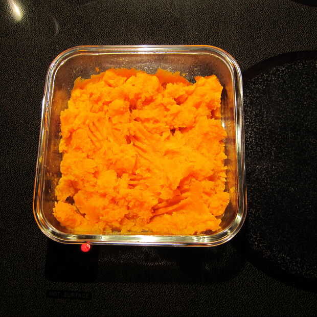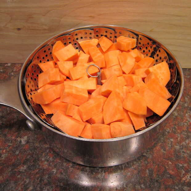 Lavado, cubo y vapor batatas hasta horquilla blanda. Puré y dejar enfriar.
