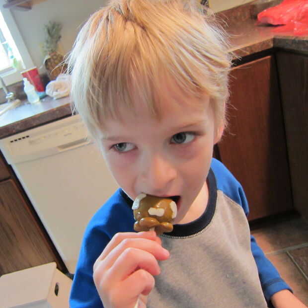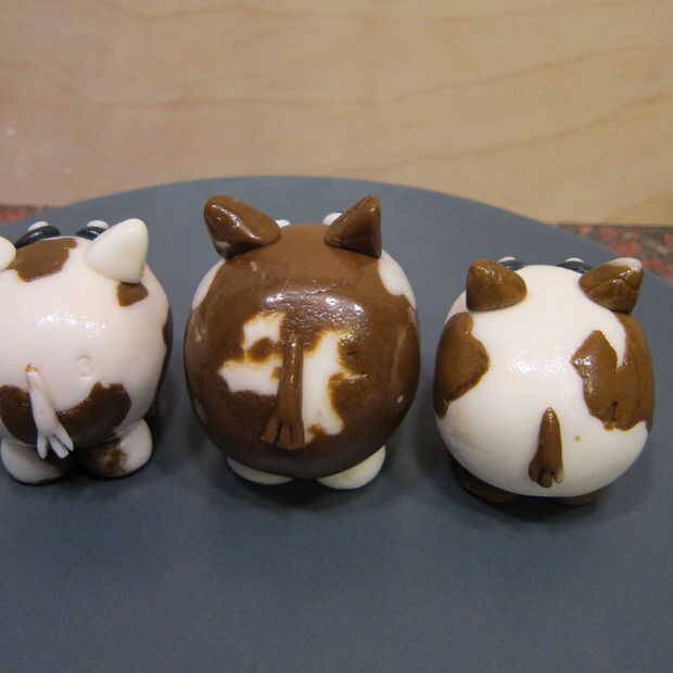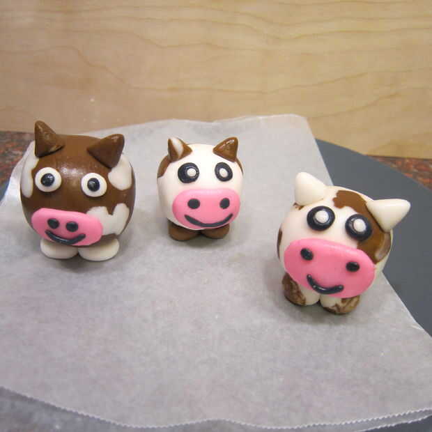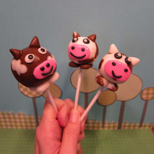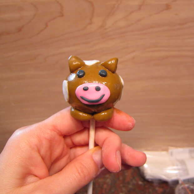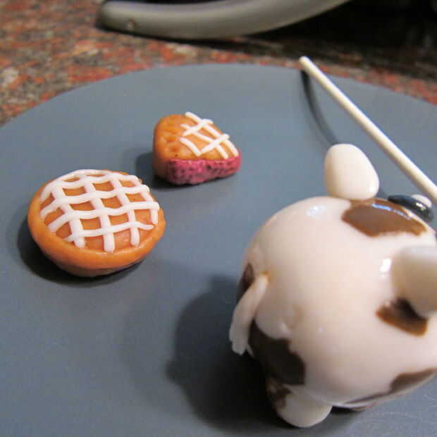Si está poniendo a las vacas en palos primero pongan la pasta de empanada en el palo y extienda el fondant coloreado lo suficientemente grande para el pop. Cubren el pop. Después en los pies y decorar el pop sin embargo usted elige. Te recomiendo refrigerar el pop después de cubrirlo con fondant. El fondant no tiene así como recubrimiento de caramelo como pops tradicionales pastel cubiertos de chocolate. Por supuesto, podría sustituir cobertura de chocolate para el fondant para que sea más fácil, pero en el espíritu del día de Pi y el concurso que quería pegarse con el perfil de sabor de un pastel real.