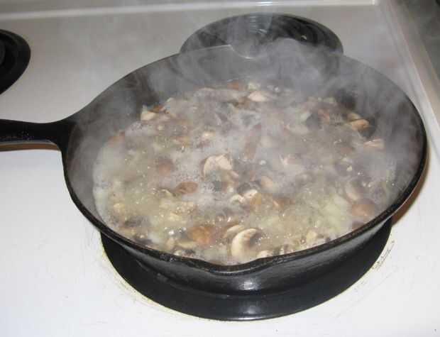 En una sartén añadir mantequilla y aceite de oliva y calor hasta que se derrita la mantequilla y freír la cebolla, ajo y setas.