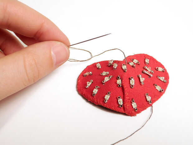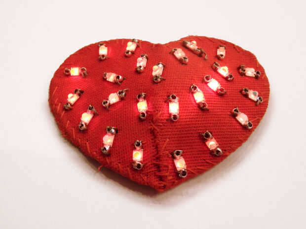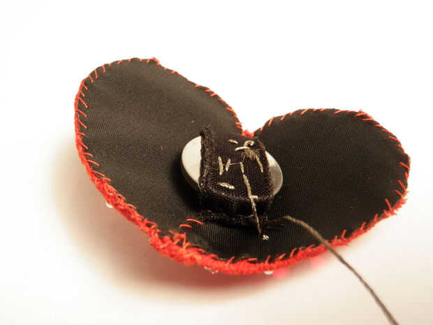 Con la batería en la bolsa, coser el hilo conectado a la terminal negativa a cualquiera de las conexiones a tierra en cualquiera de las cuentas de LED.