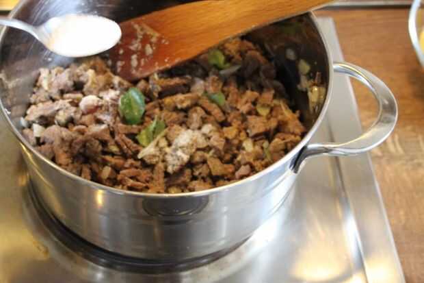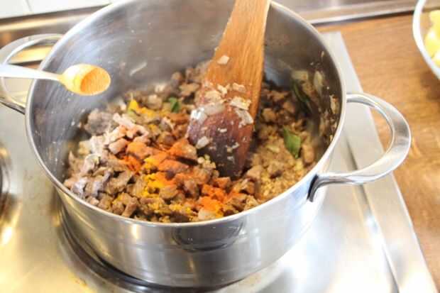 3. Añadir la carne picada, hojas de curry y sal al gusto.