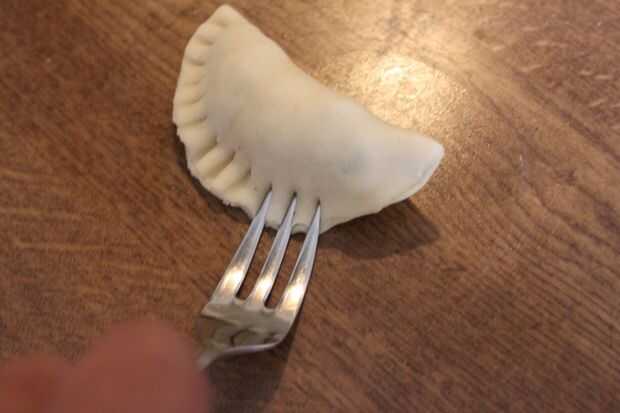 14. Presione ligeramente un tenedor enharinado alrededor del borde de las empanadas para hacer cantos.