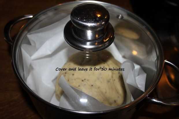 Hervir agua en una olla pequeña, verter el agua y seque, coloque la masa en la sartén caliente forrada con pergamino de la hornada. Cubrir con la tapa y coloque un lado durante 30 minutos.