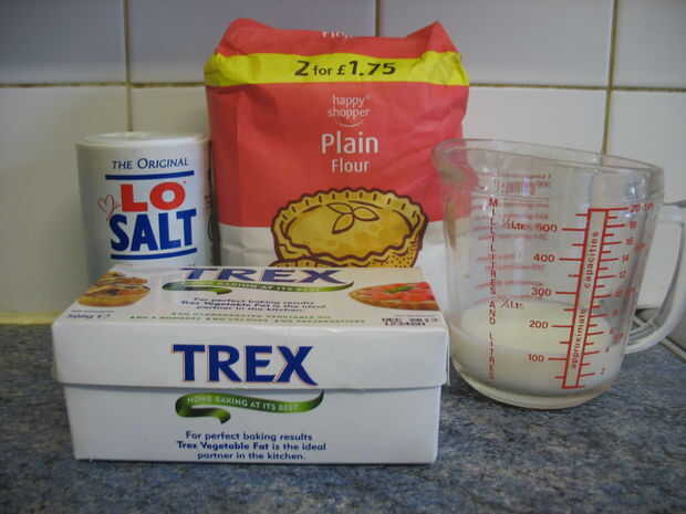 La masa utilizada fue una masa quebrada de agua caliente de la receta de "cocina de la casa." Así, de entrada necesitamos los ingredientes. Tamizar la harina y la sal en un bol y hacer un pozo. Entonces, puesto al combo de grasa y leche/agua en un cazo y calor hasta que hierva. Sabe usted que es caliente lo suficiente cuando la leche comienza a burbujear. Revolver la mezcla constantemente a lo largo y asegúrese de que los líquidos no han separado al verter en el pozo de la harina. Tan pronto como el líquido está en la mezcla de harina con fuerza (sin moviéndose caliente agua hirviendo sobre ti mismo, y hablo por experiencia.)