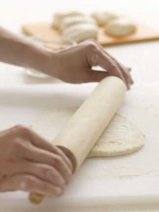 Caliente el horno a 400 grados f el. divida la masa en 6 porciones iguales. Rollo de cada una en una ronda de 8 pulgadas sobre una superficie ligeramente enharinada.