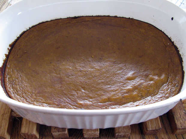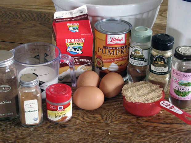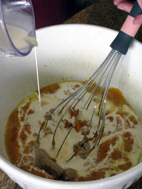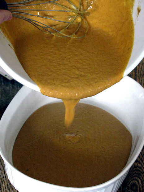 En un tazón grande, bata los huevos ligeramente. Agregue el puré de calabaza, crema de leche y azúcar moreno ligero, mezclando entre cada adición. Añadir las especias y la sal y mezclar para distribuir uniformemente. Vierta el relleno en una cazuela con mantequilla y hornear hasta que un palillo de dientes asomó en el centro salga limpio, unos 30-40 minutos.