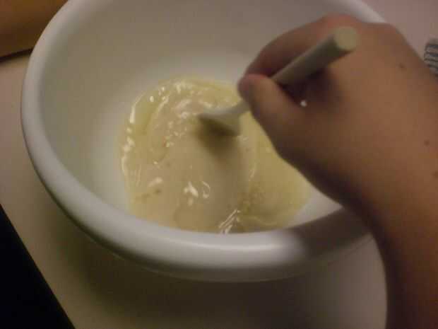 Cuando se haya disuelto la levadura, añadir la 1 cucharadita de azúcar, 1/2 cucharadita de sal y 1/4 taza de aceite y mezclar.