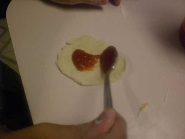 Tomar un puñado de masa y enrolle en un círculo plano. Luego ponga una cucharada o cucharada de salsa de tomate en el centro del círculo. Poner una cucharada de queso sobre la salsa de tomate. Cerrar la masa doblándola y presionando en los bordes para que peguen entre sí y forman una bola de masa hervida.