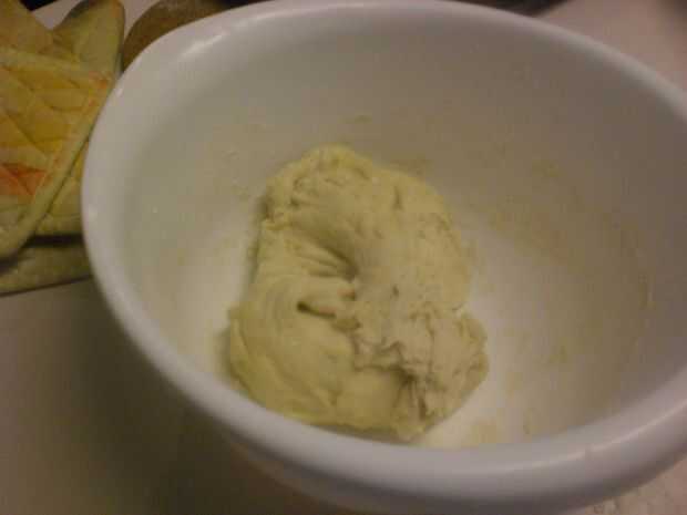 Una vez la masa ha aumentado (ver imagen), puede empezar a hacer las bolas de masa hervida. Difundir la harina en la encimera para que la masa no se pegue cuando se ruede hacia fuera.
