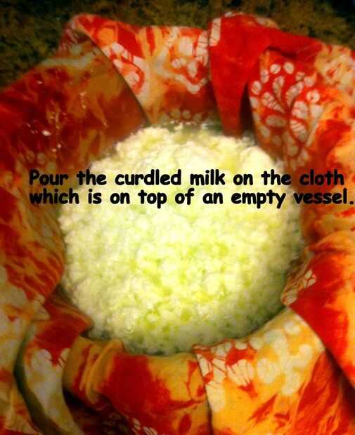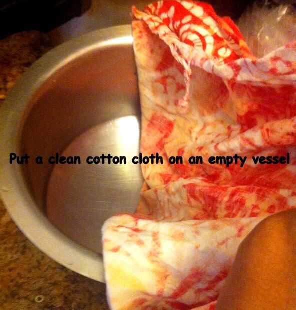 5. Vierta la leche caliente sobre la tela que coloca sobre un recipiente vacío.
