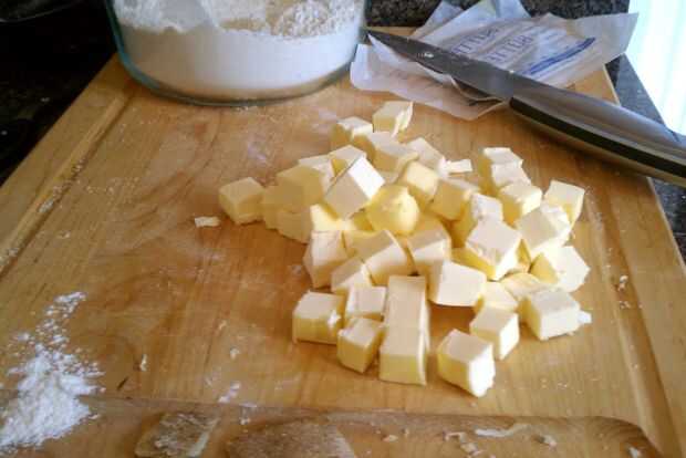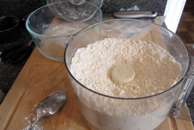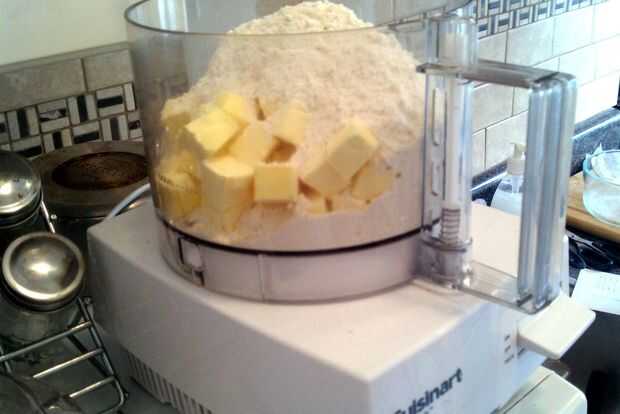 Trocear la mantequilla congelada en trocitos, luego pulso en un procesador de alimentos con los ingredientes secos hasta que se mezcle solo. Alternativamente, cortar la mantequilla en la mezcla de harina a mano. La masa debe estar polvorienta y debe haber bolitas de mantequilla a lo largo.