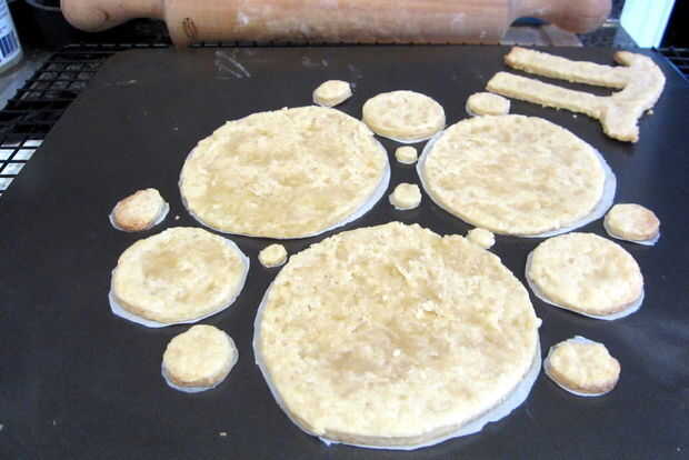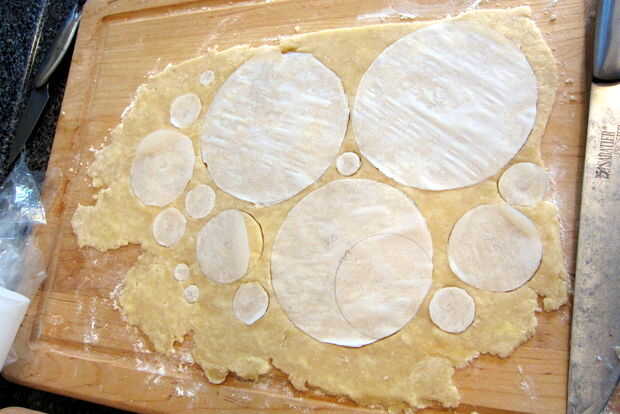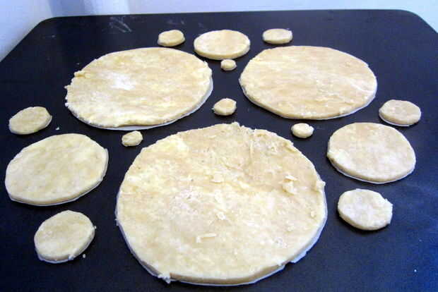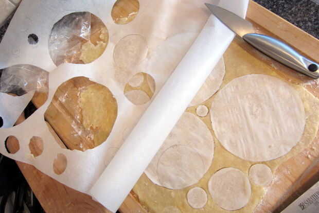 Para el diseño de la corteza, estirar la masa a 1/4 de pulgada de espesor y presione ligeramente el papel de pergamino con los círculos en la masa enrollada. Con la punta de un cuchillo filoso, cortar cuidadosamente cada círculo y dejar el papel marcado prensado cada círculo de masa de fácil etiquetado y transporte. Coloque los círculos pergamino hacia abajo, sobre una bandeja grande.