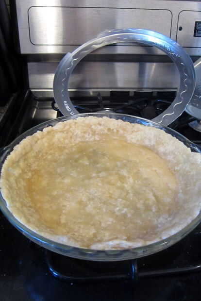 Congelar el plato y los círculos por 10 minutos la mantequilla. Luego cubrir el plato con el papel o pergamino y añadir pesas de pie o frijoles para ayudar a que el plato lleve a cabo su forma. Cubrir los círculos con una hoja grande de papel de aluminio también.