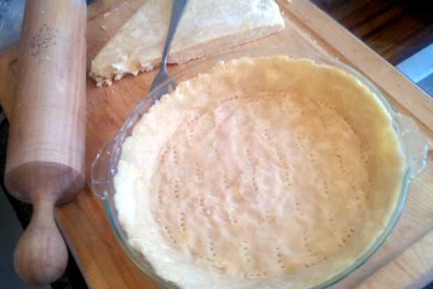 Para el plato, estirar la masa hasta que quede un círculo grande 1/4 de pulgada de espesor, luego presione la masa en un plato de pastel de 9.5 pulgadas. Muelle de la masa con un tenedor.