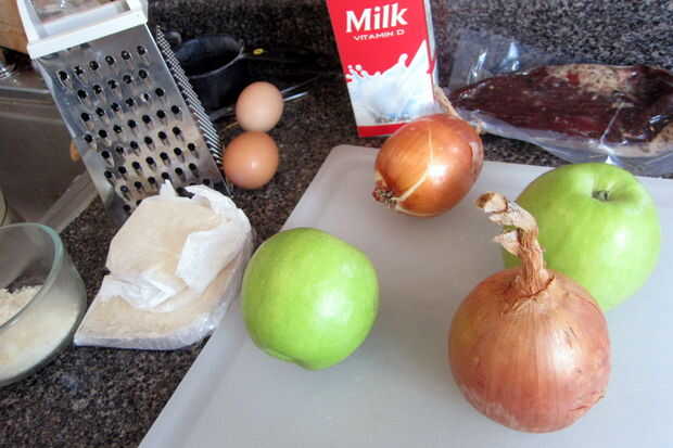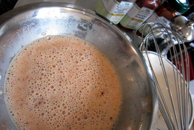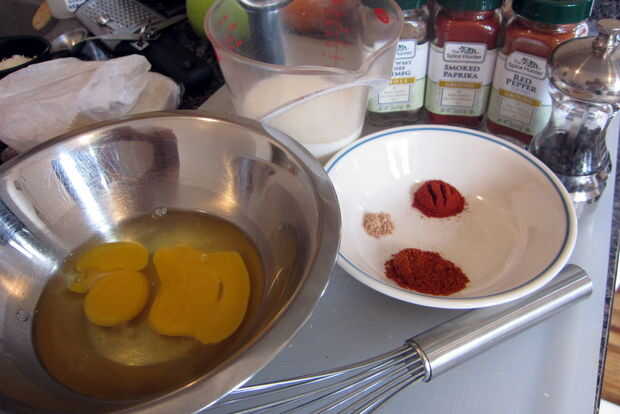 En un bol, batir la leche y los huevos con los condimentos, mientras que el pan relleno se enfríe un poco. Condimente un poco va una manera larga!